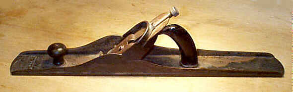 The planes are a very simple design and strike one as a rather cheap blob of cast iron upon first glance. They have a characteristic arch to the casting, right where the iron is carried. The tote, which looks for all the world like a goat's horn, is a piece of grooved wood that sandwiches and is screwed to a portion of the casting that bends forward from the bed, up to the arched area, where it finally joins the arched part of the casting. Together, the tote and the arch buttress each other. The low side rails of the main casting are reminiscent of the design used on the Chaplin planes, with semi-scalloped shapes over their lengths.
