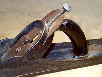 The planes exhibit just how much force can be placed on the plane iron, as the tool is pushed over the wood's surface. As the iron bites the wood, the natural reaction is for the iron to be thrust backward, but the iron can't be permitted to move backward or it won't cut (it's that path of least resistance thing). Whatever means is used to secure the iron, it must be strong enough to prevent the iron from being thrust backward. On the Stanley planes, as well as many others, it's the lever cap that secures the iron in place. On wooden planes, it's the wedge. But on The Challenge plane, it's the arched portion of the casting that bears the brunt of the force. All that force is transferred right to the point where the depth adjuster threads into the casting. Because of this shoddy design, most of The Challenge planes are found broken along the arched casting (as indicated by the tiny red arrow in the image). This breakage may come as a surprise to some, as I'm certain it did to the original purchasers of The Challenge planes, but it speaks volumes about the rigors placed on plane irons and the many means that are used to hold them firmly in place.