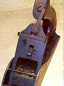 The lateral adjusting lever had to be designed to circumvent the patent rights Stanley had earlier filed for the same. Hayworth's adjuster is sorta a rack and pinion-like style, where a cross bar is pinned and pivots on a lever. The sides of the cross bar are bent upward so that they butt against the edge of the iron and don't engage it directly like on the Stanley design. The Hayworth adjuster is not smooth, and it has a tendancy to snap into position at the extremes of the adjustment's range - not a very desirous feature when trying to make a fine adjustment to the iron's lateral position. The lever itself is a twisted piece of steel, very much like that used on the Sargent&Co.'s lateral adjuster.
