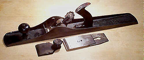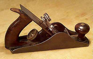 Something caused Steers to redesign the plane as he was granted another patent on January 6, 1885. This patent is a radical departure from his earlier, and somewhat successful, design. The new design dispensed with the dovetailed rosewood strips into the sole (the manufacturing cost of this feature alone must have been tremendous). The dual purpose lever cap was dropped in favor of the common double iron arrangement (a separate and dedicated cap iron is screw to a slotted iron). The lever cap screw is now cast of a design with petals radiating from the center. The model numbers were changed with "40" being the new prefix; e.g., 403, 404, etc.