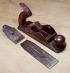 Apparently, many guys thought composite soles to be a worthwhile feature, and the design sold rather well (when compared to other manufacturers' planes). The company offered the plane in #3 through #7 sizes, using their own numbering system where the Bailey number is preceded with a "30"; e.g. the 303 corresponds to the #3, the 304 corresponds to the #4, etc. The iron is stamped with the patent date, Steers' name, and the size. The company also made block planes many of which have elaborately cast and fragile lever cap screws that are reminiscent of Leonard Bailey's Victor block plane lever caps. Ultimately, after the Bailey patents had expired, the company took to manufacturing Bailey-style planes but with dovetailed rosewood strips in their soles.