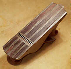 Back to Steers. His planes are made very well, and were one just to look at the tool sitting flat on the bench, the tool's coolest feature would easily be overlooked. Flipping the plane over reveals one of the strangest ideas ever to be applied to a metallic plane. The sole is a composite construction, where rosewood strips are dovetailed, yes dovetailed, into the sole! I kid you not. Just have a look at the image, to see for yourself. The sole has four strips dovetailed into the sole ahead of the iron and 3 strips dovetailed behind the iron, and all of these strips are flush with their surrounding metallic surfaces. These strips were touted as preventing "the plane clinging to the work." In other words, it was this company's version of corrugations.