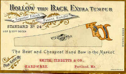 The advertising trade card shows the exact saw touted by the company. This card dates from the late 1880's to early 1890's and is very rare, as is most of tool ephemera from that era. Unlike the purveyors of medical quackery, sewing machines, stoves, pump organs, etc., all of whom relied heavily upon the Victorian advertising via trade cards, tool companies rarely employed such things to spread the word about their products.