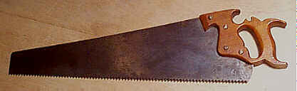 One such manufacturer, a partnership, Wheeler, Madden&Clemson, decided to set-up operations in Middleton, NY where the firm produced a wide range of fine products from ca. 1860 to 1890. However, they needed to distinguish themselves from the rest of the saw-pack if they were to keep the loan officers at bay. Their brilliant idea was to make a shapely handle with a distinctive 'notch' cutout above the closed portion of the handle. This notch was designed so that the worker could flip the saw around, with the teeth pointing away from his body, and cut backwards with it. His thumb fits into the notch with his hand closing over the handle's cheeks. Several other manufactures, like Disston and Simonds, made similar handles to satisfy the blossoming demand for backward sawing.